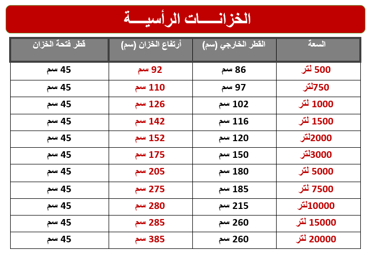 السعات: من 500 لتر حتى 20,000 لتر (سعات خاصة متاحة حسب الطلب).